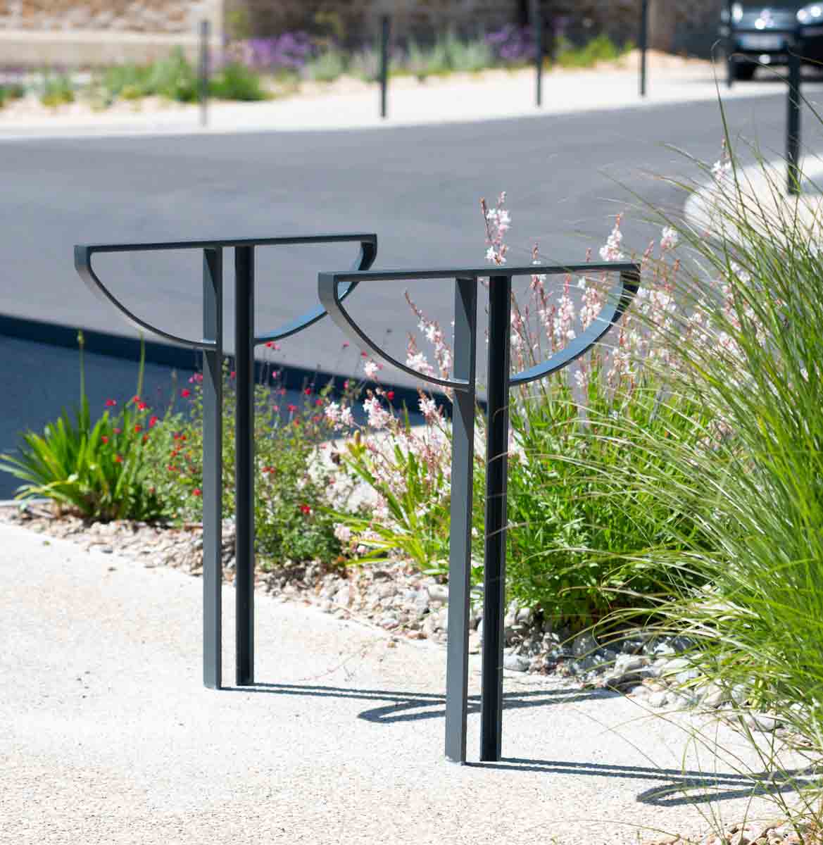 Das T-Profil in Stahl, ohne sichtbare Schweißstellen, das die Pfosten für diesen Fahrradanlehner bildet, geht auf den Poller Antarès zurück. Dadurch wird dem Fahrradanlehner Antarès eine sehr hohe Robustheit verliehen, sowie ein graphisches Design. Die Stütze in Form einer Radhälfte, die dieses Mobiliarelement charakterisiert, gewährt ein sicheres Befestigen von Rahmen und den Rädern des Fahrrads.
